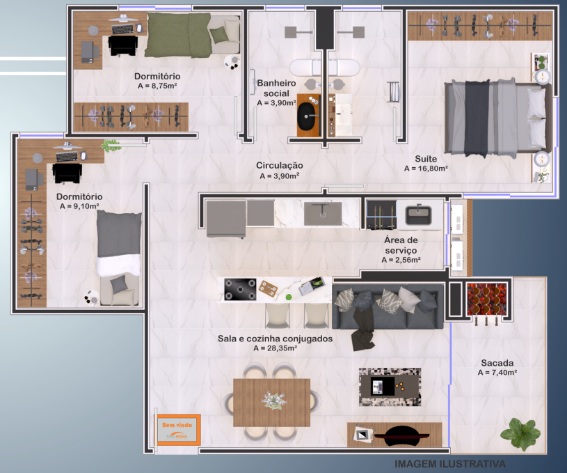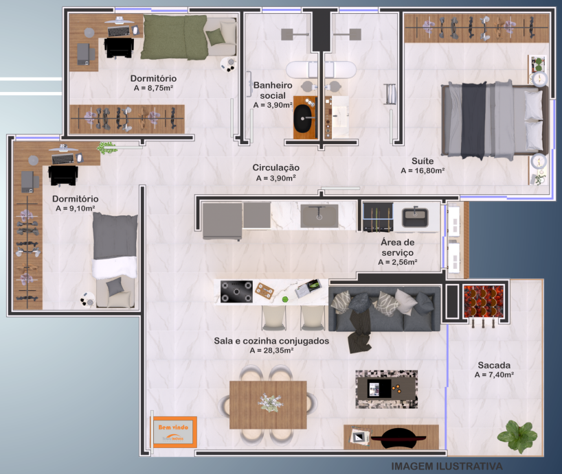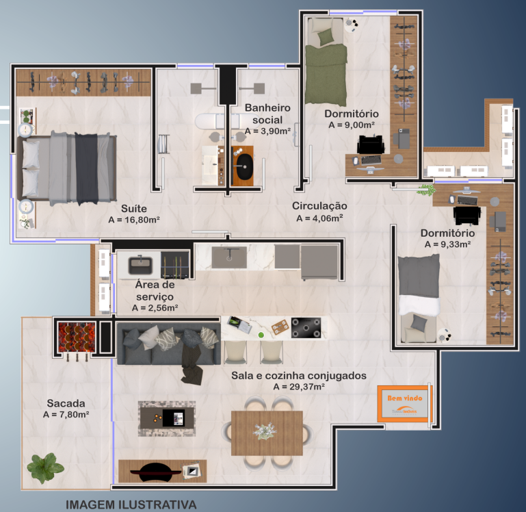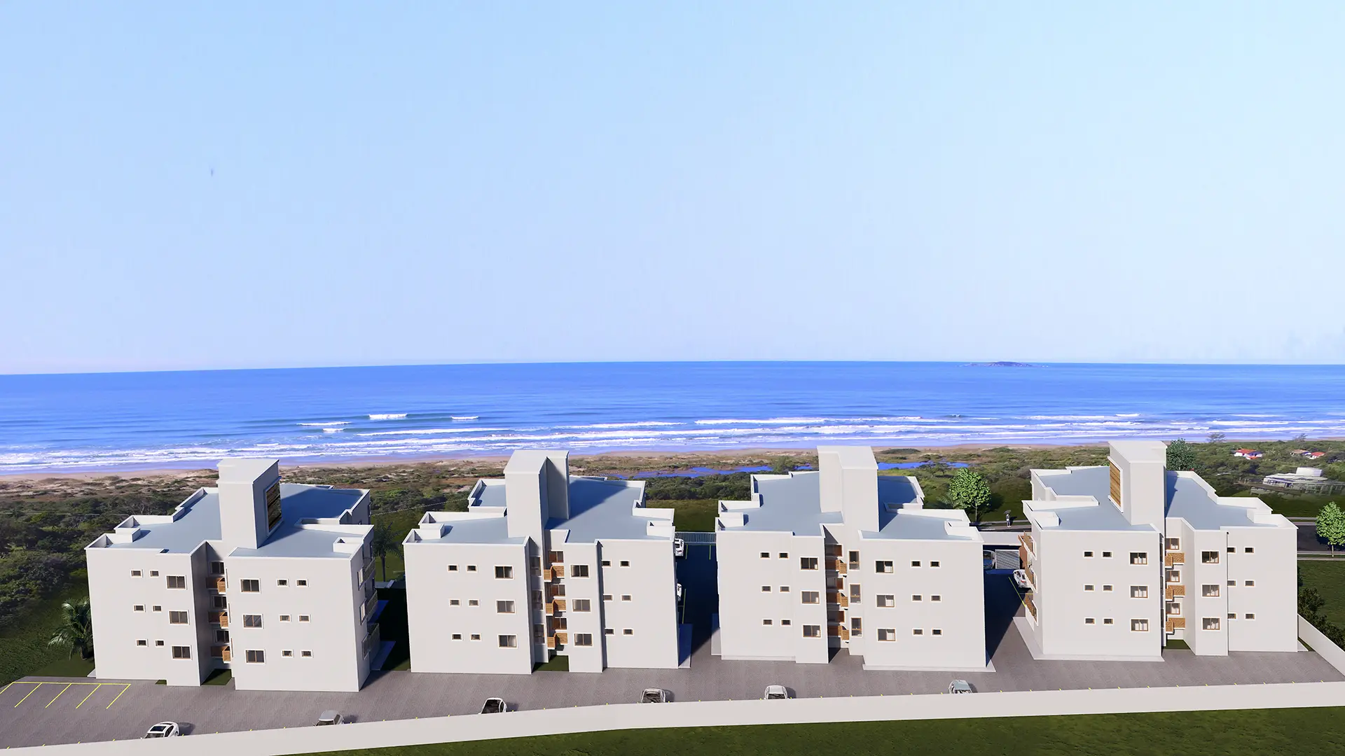 Apartamentos com 92,47m², 3 quartos, sendo um deles suíte, sala cozinha em ambiente integrado, com acesso a sacada com churrasqueira e vista para Praia da Vila.