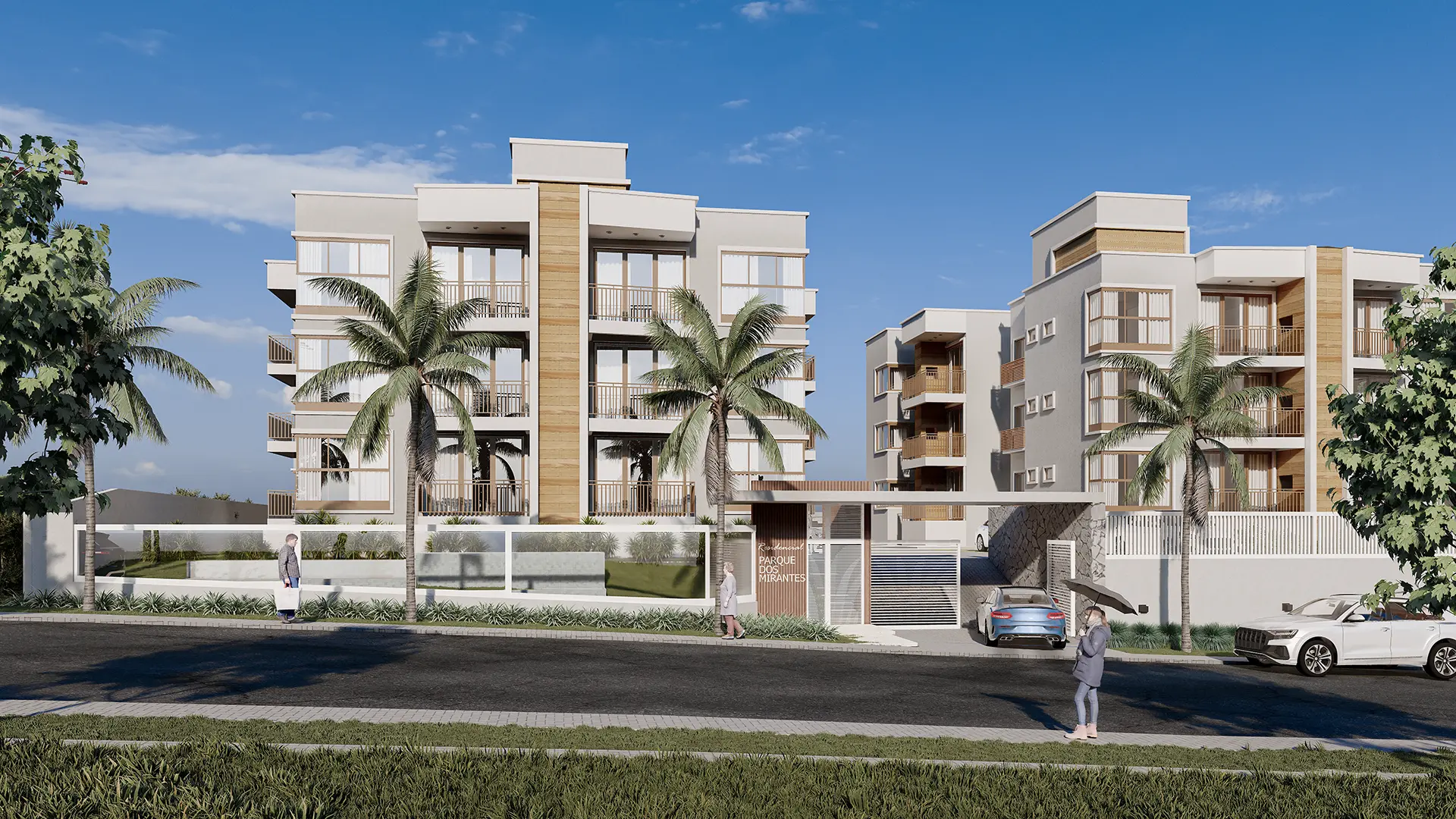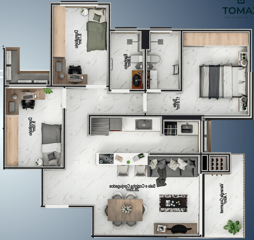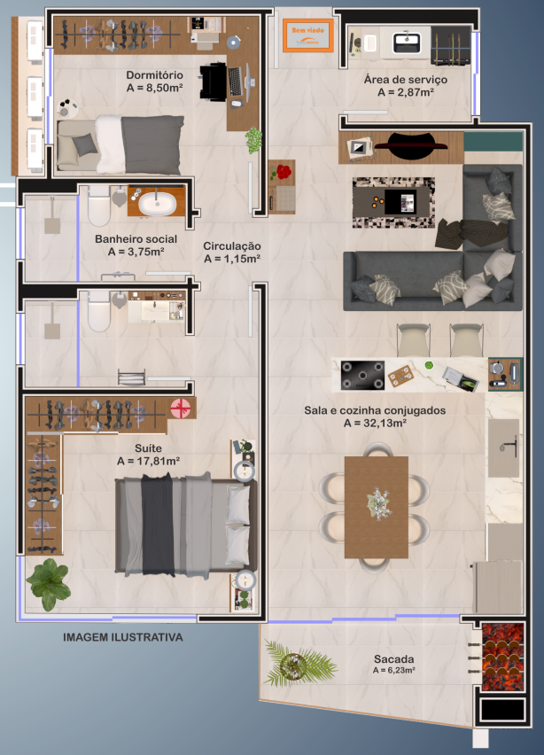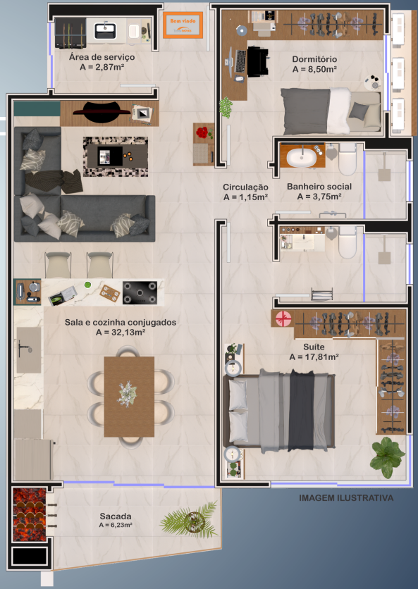 Apartamentos com 80,62m², 2 quartos, sendo um suíte, sala cozinha em ambiente integrado, com acesso a sacada com churrasqueira e vista para