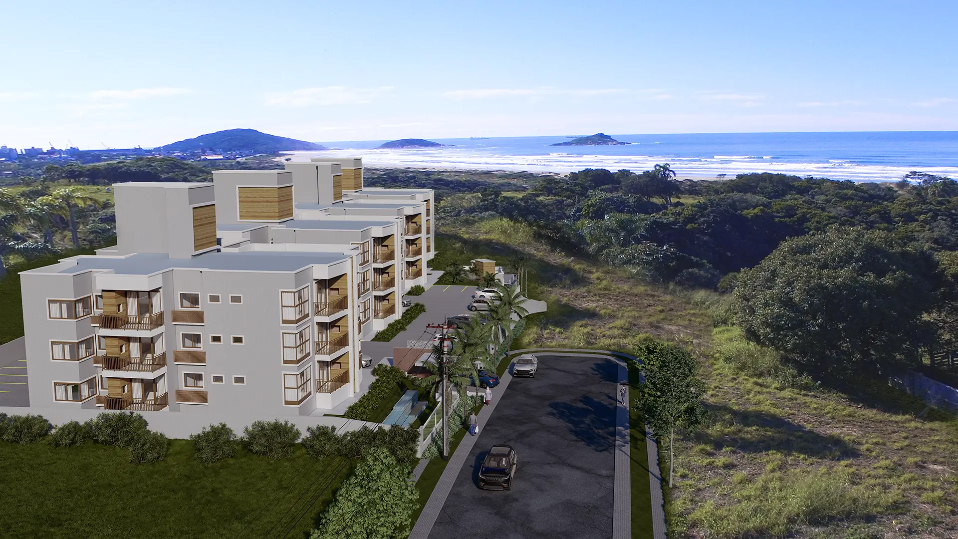 Apartamentos com 80,62m², 2 quartos, sendo um suíte, sala cozinha em ambiente integrado, com acesso a sacada com churrasqueira e vista para Praia da Vila.