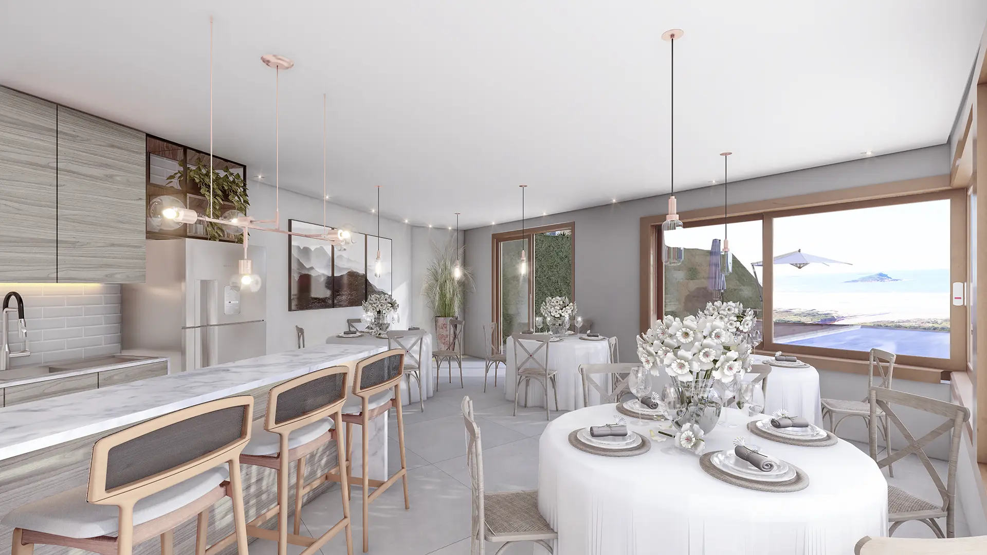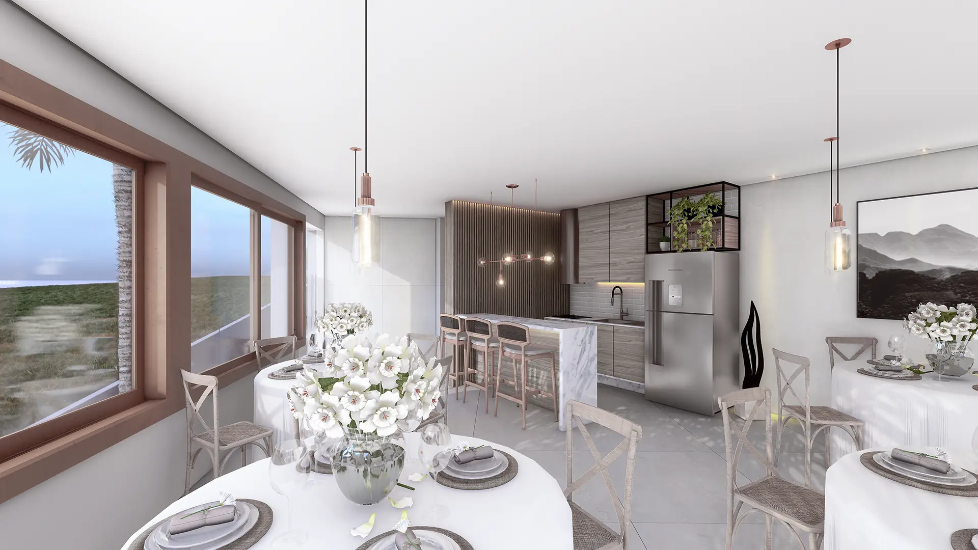 Apartamentos com 90,36m², 3 quartos, sendo um suíte, sala cozinha em ambiente integrado, com acesso a sacada com churrasqueira e vista para Praia da Vila.